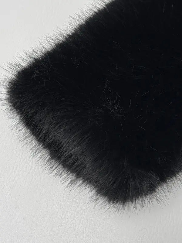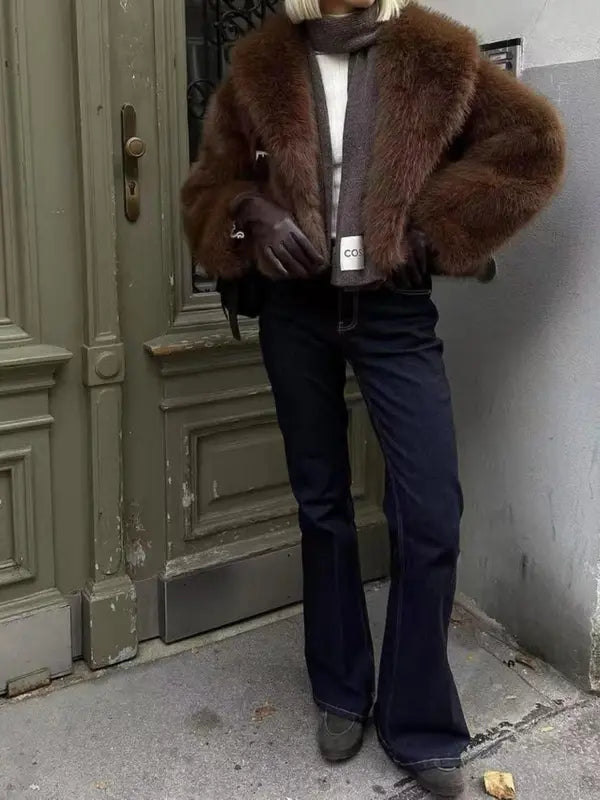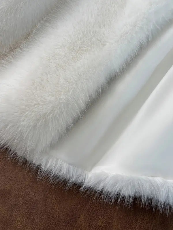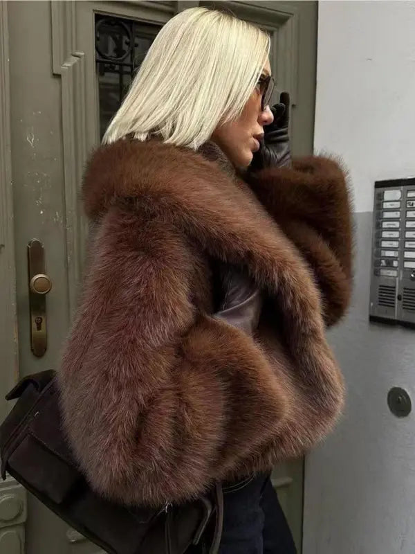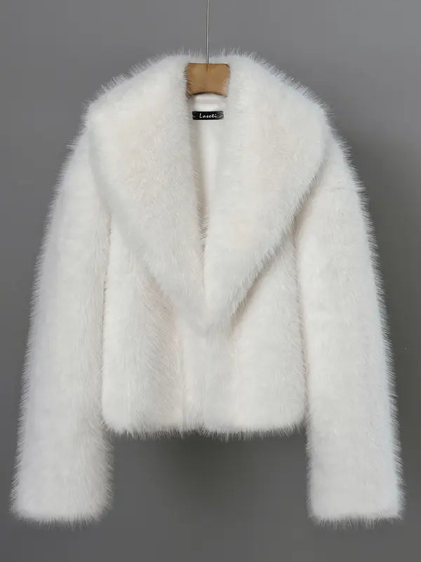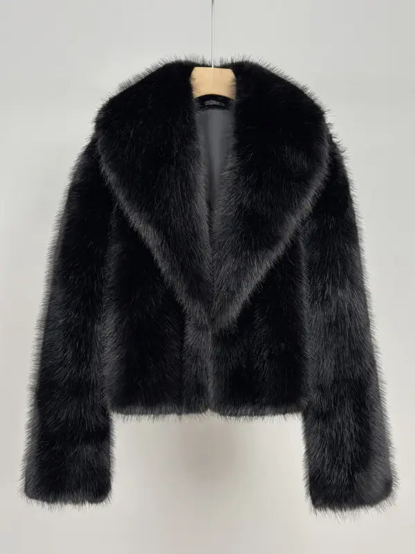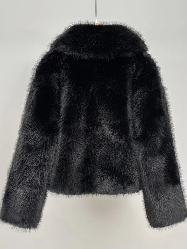 Giacca in pelliccia sintetica con collo a revers e maniche lunghe. Tasche anteriori. Fondo diritto, fodera interna in tono.